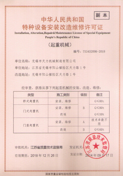 2014年8月,我公司顺利完成《特种设备安装改造维修许可证》复查工作,并由江苏省质量技术监督局颁发《特种设备安装改造维修许可证》。获此证书,标志着我公司又跃上了一个新的台阶,同时也是积极参与市场竞争,优质服务于广大客户,争取更大的市场份额。公司将进一步贯彻执行质量保证体系文件,提高全面质量管理水平,积极参与市场竞争,以高质量、高品位和的售后服务满足市场和广大客户的需求。![]() |