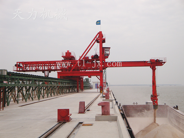 装、卸船机主要用于港口码头船舶的装卸物料作业的设备,它具有装卸速度快,生产效率高,前大梁可作俯仰或前后伸缩动作等特点。本机可在轨道上运行,物料通过皮带传输机及出料口送至码头堆场及货船上,是物料装卸的理想设备。
